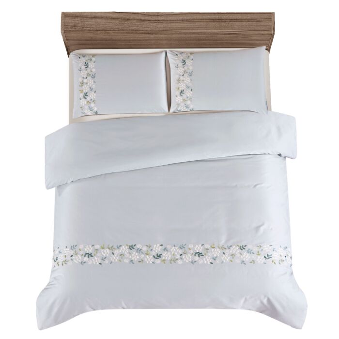 Bettwäsche in Hellblau mit floral besticktem Bordürenmotiv